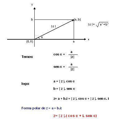 A figura acima, de forma bem detalhada, mostra que um número complexo não nulo z = a + b.i pode ser representado na forma polar, (ou forma trigonométrica ), que é a seguinte: z = |z|.( cos a + i.sen a).
